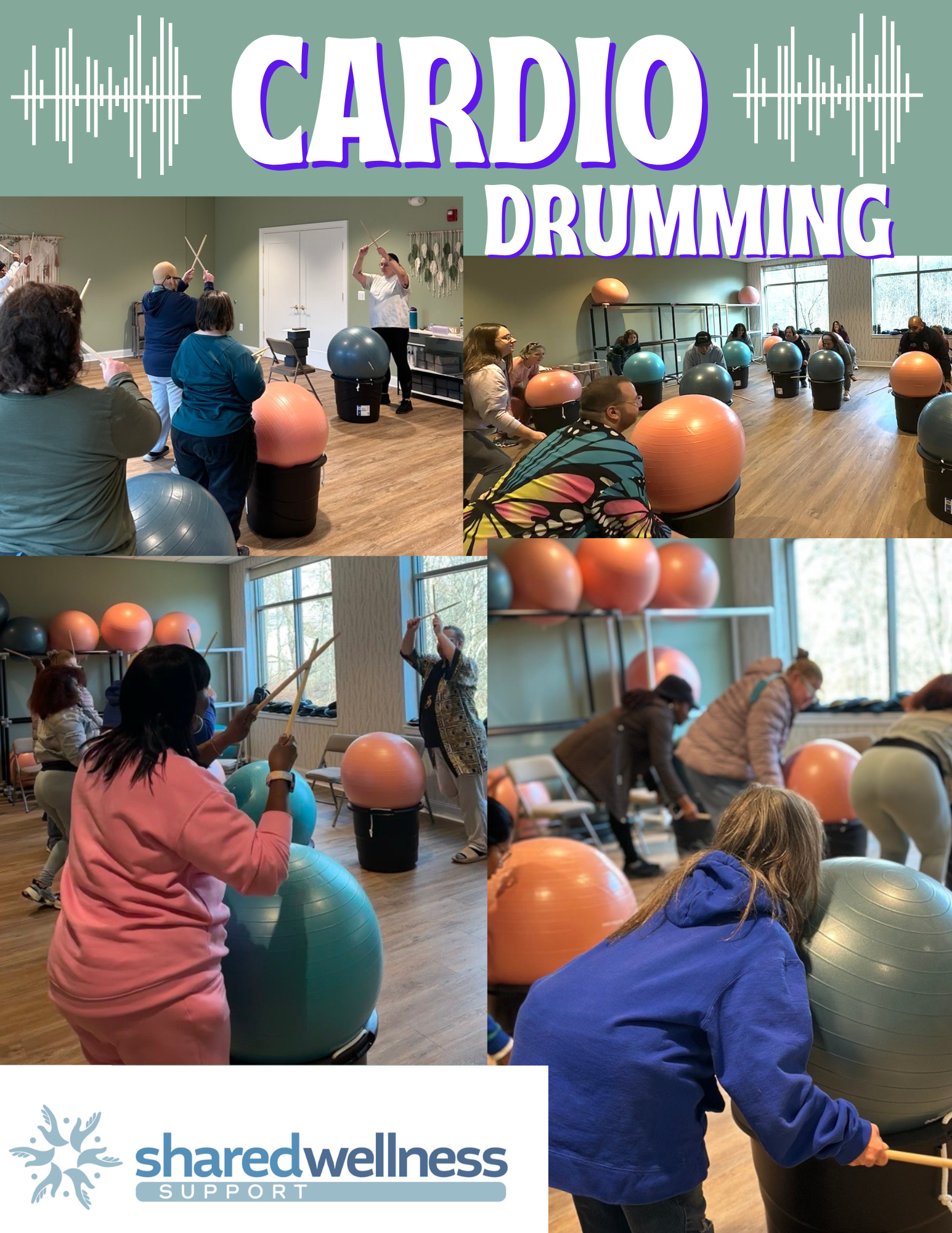 Cardio drumming is a high-energy group fitness workout that combines aerobic exercise, rhythmic movement, and drumming. We utilize large stability balls, drumsticks, and buckets as equipment. During the sessions, we listen to upbeat music, with each song featuring choreographed movements that the instructor will show and participants follow along. The routines combine rhythmic drumming with full-body movements, creating an energetic and engaging cardio workout. |