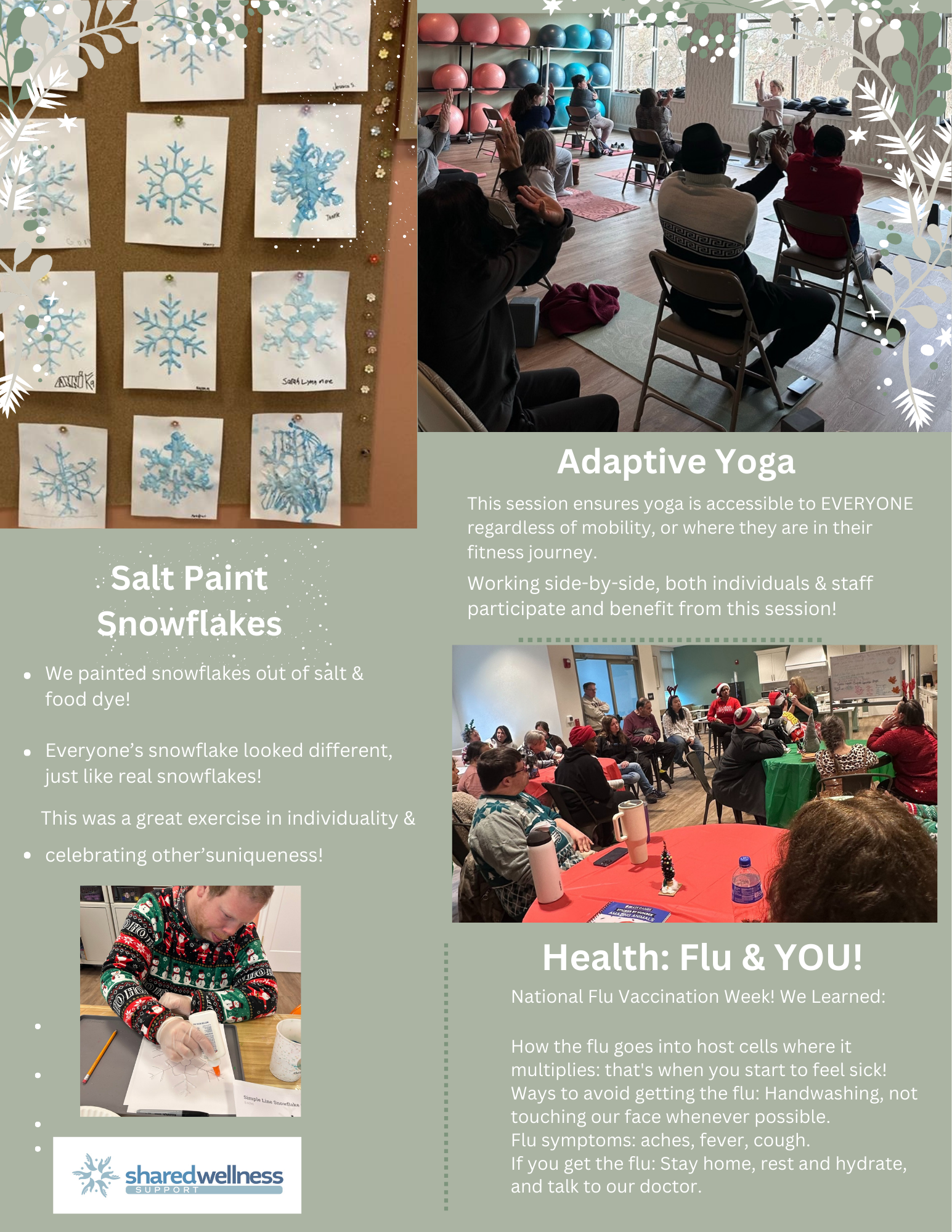 Participants explored wellness through salt-paint snowflakes, ornament-making, and mindful movement — celebrating individuality, creativity, and self-expression. We also recognized National Flu Vaccination Week, sharing simple ways to stay healthy. Adaptive Yoga and Brain Dance reinforced that wellness is for everyone, bringing calm, connection, and accessible movement for all. |