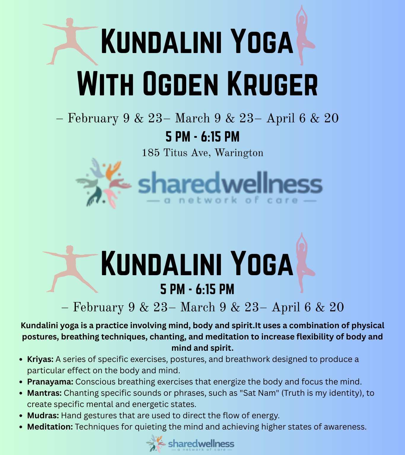 Back to All Events Kundalini Yoga Monday, February 9, 2026 5:00 PM Monday, April 20, 2026 6:15 PM Shared Wellness 185 Titus Avenue Warrington, PA, 18976 United States (map) Google Calendar ICS Book Here